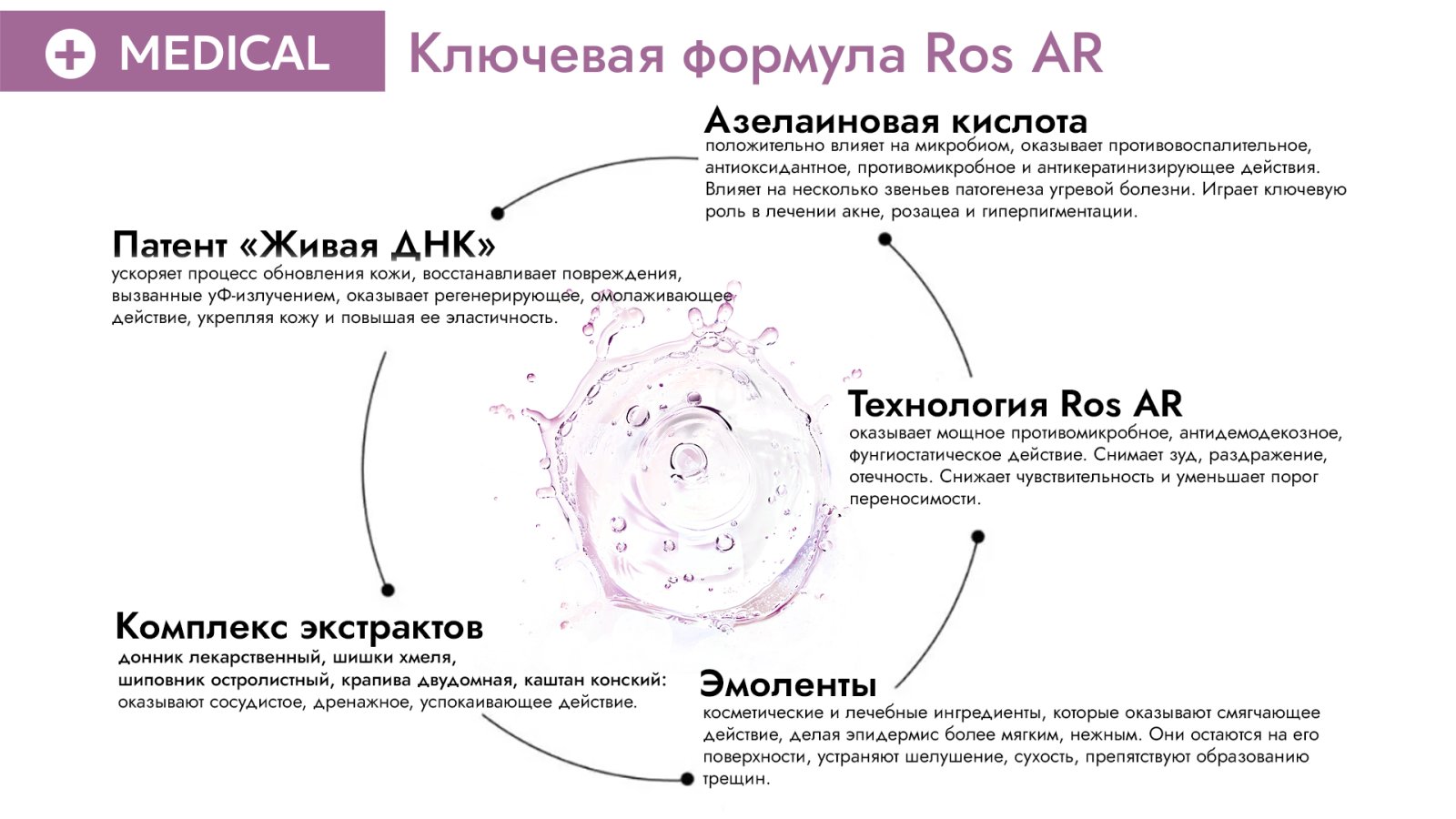 3. Технология Ros AR - оказывает мощное противомикробное, антидемодексное, фунгиостатическое действие. Снимает зуд, раздражение, отечность. Снижает чувствительность и уменьшает порог переносимости.