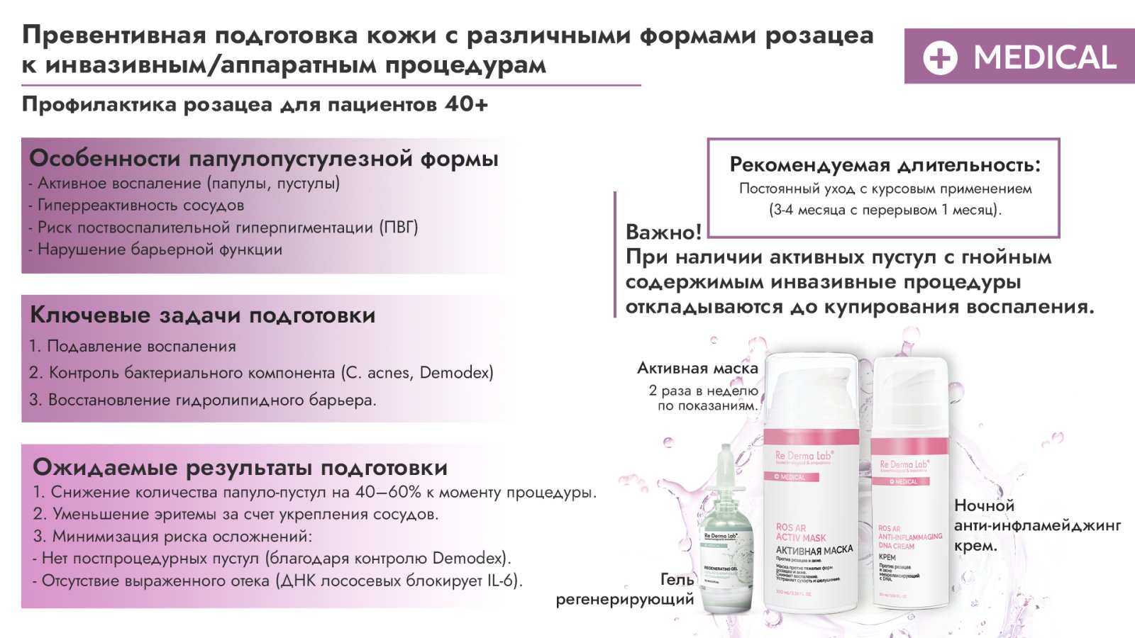 Фокус на розацеа, возрастное акне, демодекоз, себорейный дерматит, покраснения и шелушение.