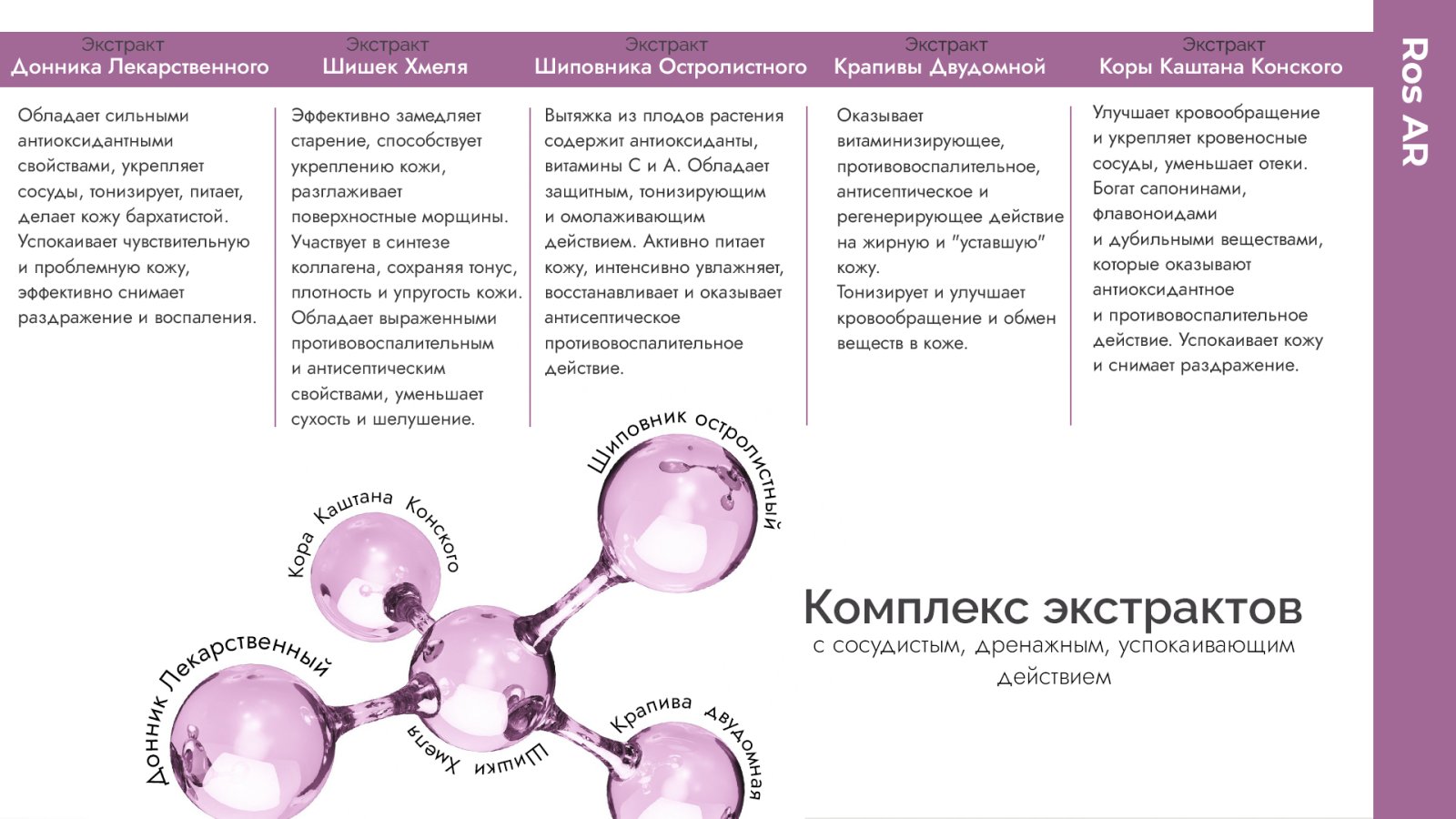 Шиповник остролистный - вытяжка из плодов растения содержит антиоксиданты, витамины C и A. Обладает защитным, тонизирующим и омолаживающим действием. Активно питает кожу, интенсивно увлажняет, и восстанавливает и оказывает антисептическое противовоспалительное действие.